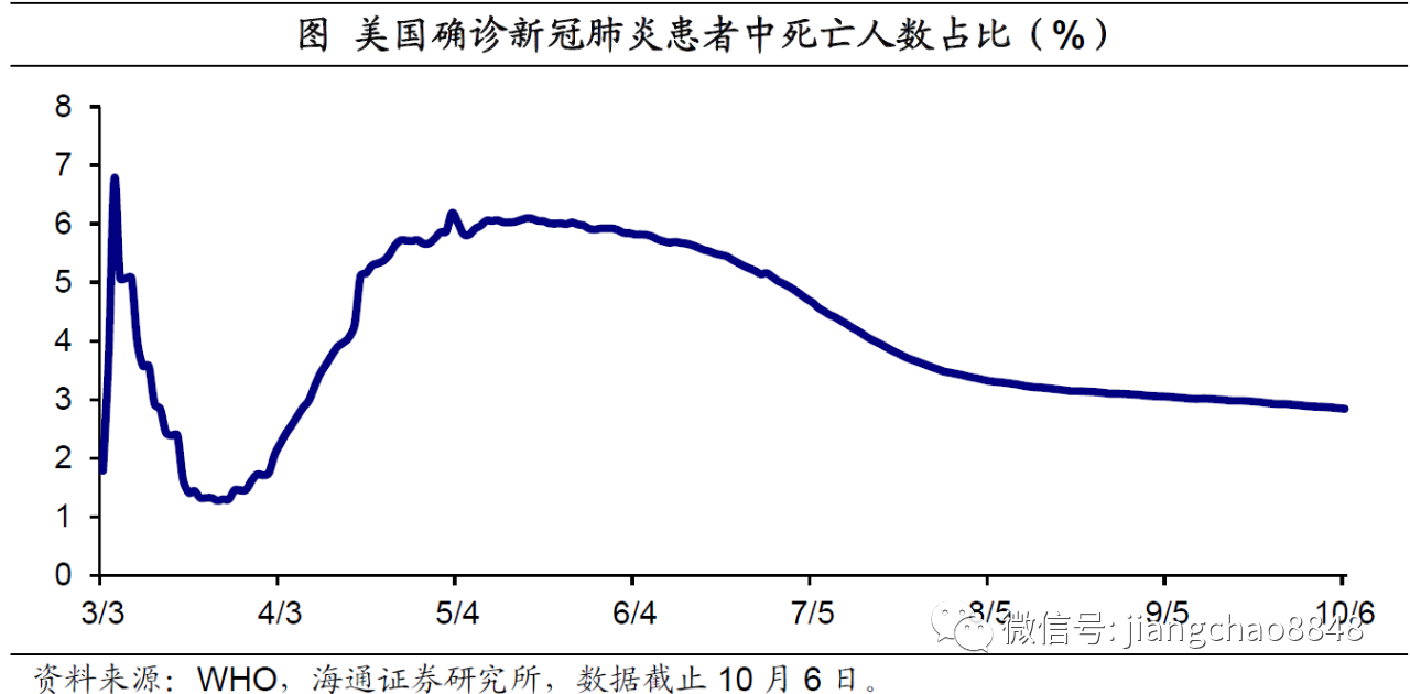 美国的情况也同欧洲类似,从死亡率上来看,截至10月6日,美国所有确诊患者之中,累计死亡人数占比已降至2.84%,远低于疫情在美国刚开始暴发时的瞬时高点6.77%,也不足第一轮疫情高峰时顶部值6.18%的一半。因新冠肺炎而死亡的患者比例持续减少,意味着应对疫情的医疗手段取得了一定的效果。