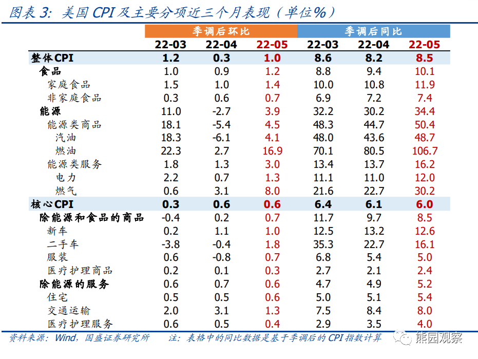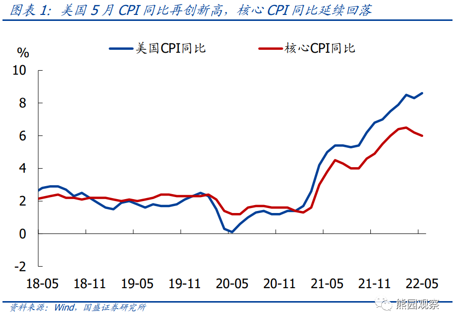 1、美国5月CPI同比再创新高,主因俄乌冲突升级带动能源价格大涨;核心CPI同比延续回落,但仍高达6%。