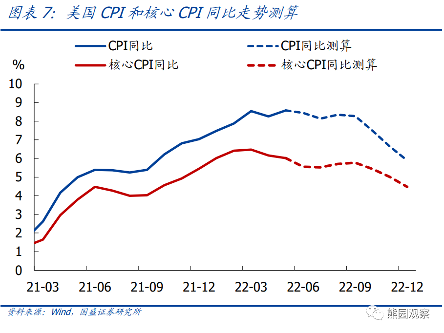 >美国通胀展望:前期报告中我们多次指出,美国通胀基本遵循“能源分项决定方向,其他分项决定幅度”的原则。中性情景之下,短期内能源价格受俄乌冲突影响将维持高位,但中长期由于全球经济放缓、俄乌冲突影响消退,能源价格将趋于下跌;同时,随着消费需求放缓、全球供应链修复等因素,核心通胀压力将逐步减轻。据此测算,美国6-9月CPI同比可能仍会保持在8.2%-8.6%高位区间,10月以后才有可能出现明显回落,年底预计在6%左右;核心CPI同比3季度可能小幅反弹,4季度将回落,年底预计4.5%左右。