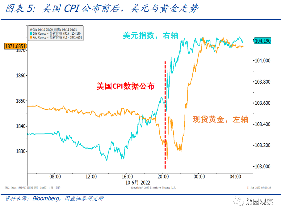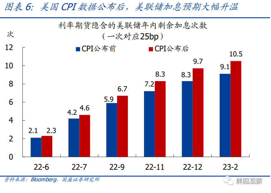 >加息预期变化:CPI数据公布前,利率期货隐含了6月和7月各加50bp,9月有过半的概率会加50bp,年内剩余加息次数为8.3次(每次25bp)。CPI公布后,利率期货数据变成了6月加50bp,7月和9月均有可能加75bp,年内剩余加息次数升至9.7次,反映出加息预期大幅升温。