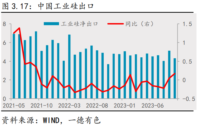 据海关统计2023年1-10月份中国工业硅累计净出口46.3万吨,同比减少9.7%,出口数据在9月份开始呈现修复状态,预计全年出口量55万吨。