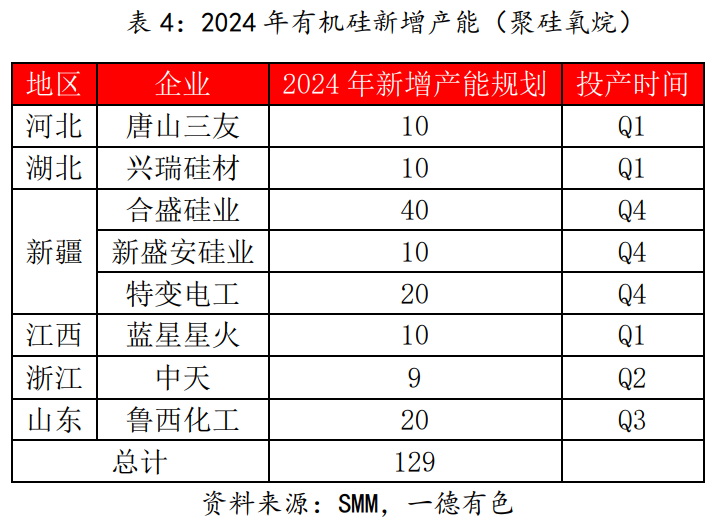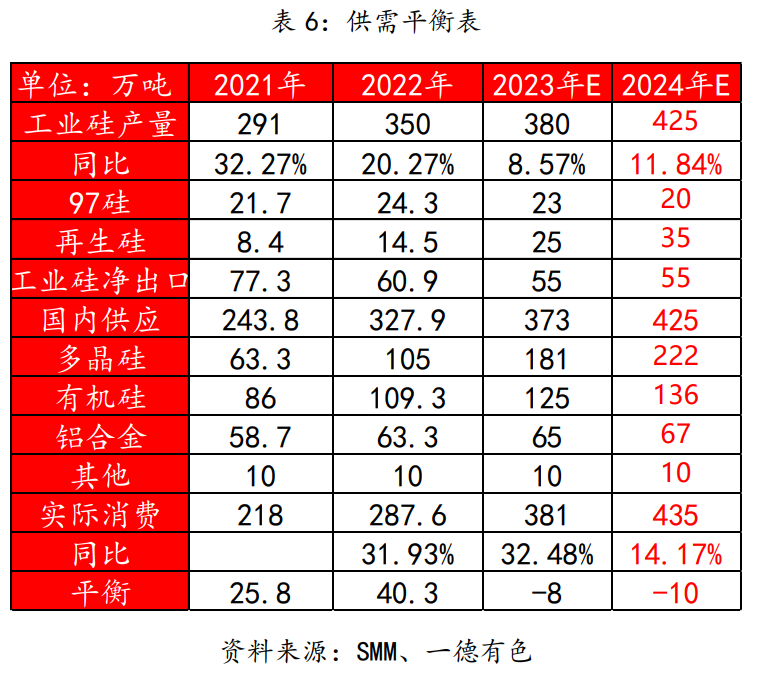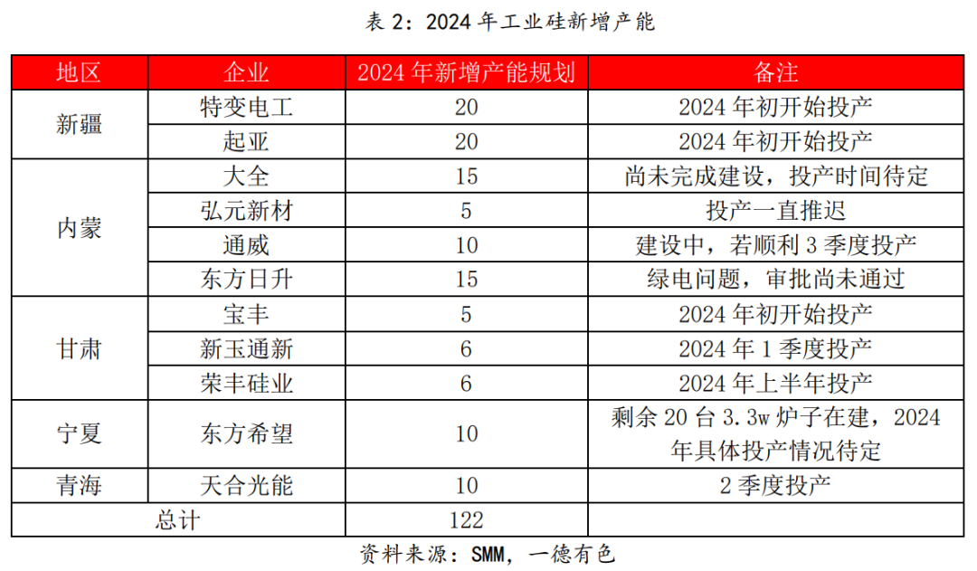统计2024年存在投产规划产能122万吨,其中上半年大概率投产产能约65万吨,其余项目存在推迟等不确定因素较大,预估全年投产产能达到90万吨左右,全年产量425万吨,同比增加11.8%,97和再生硅总产量55万吨,同比增长19.5%,工业硅总供应480万吨,同比增长12.6%。