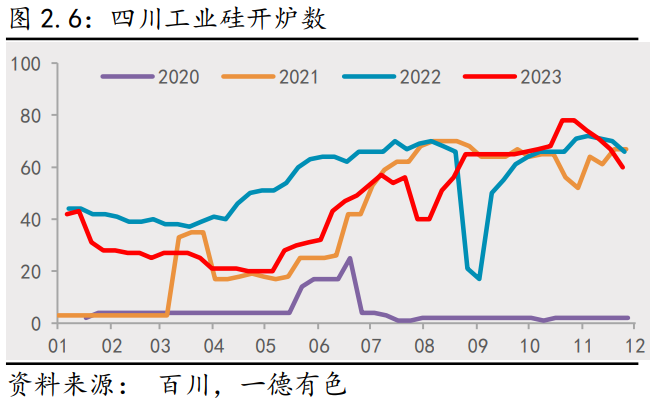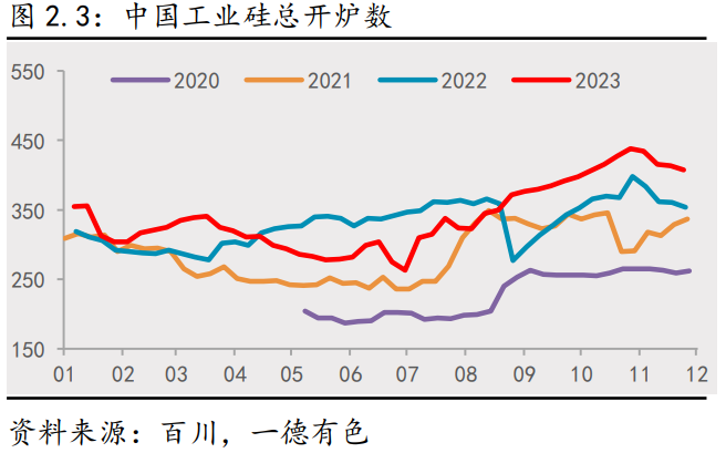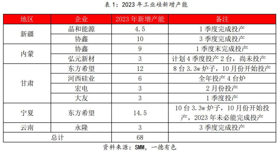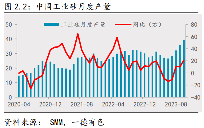 据统计2023年国内工业硅新增产能月68万吨,其中宁夏东方希望4季度投产,投产周期或延长到2024年1季度,弘元3万吨产能目前尚未投产,12月份能否投产尚不确定,因此预估2023年全年完成投产产能55-60万吨左右。全年预计产量380万吨,同比增长8.6%。