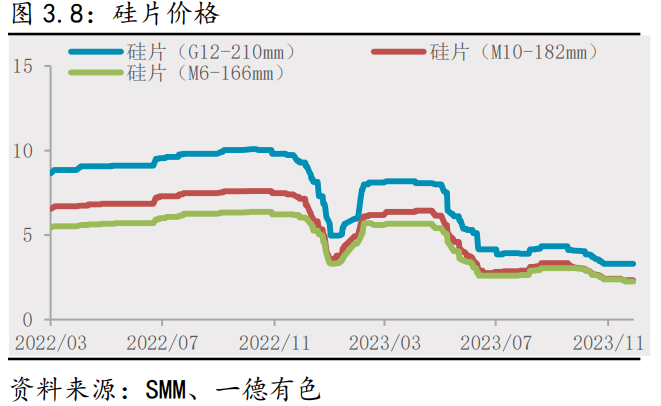目前枯水期西南减产西北增产,整体周度产量环比小幅下滑,但下滑幅度不足以扭转当前市场心态,当前下游消费存在刚性需求,但下游对市场价格并不乐观仅刚需采购尚未产生补库心态,难以推动工业硅整体价格上涨,仅非主流牌号供应偏紧价格有所上涨,等待终端的补库或将引发一波小的上涨行情。展望2024年,隐性库存显性化后,库存的绝对高度或成为抑制市场信心,供需平衡方面需关注多晶硅和工业硅的投产进程能否产生阶段性的供需错配从而给予硅价上涨动力,预计2024年全年价格波动区间12500-15000元/吨。