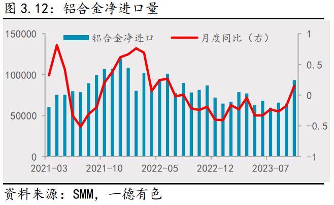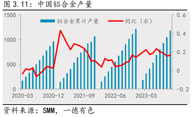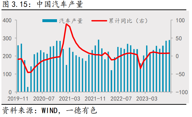 据国家统计局数据统计1-10月份中国铝合金产量1183.5万吨,同比增长17%,预计2023年全年中国铝合金产量1470万吨,同比增长20%,但由于废铝使用量的增加,造成对工业硅消费增量贡献有限,预计为65万吨。铝合金最主要消费终端为汽车、光伏及地产行业,地产方面,房屋竣工面积55150万平方米,累计同比增长19%,地产竣工数据的高增速维持的强度和周期超过市场预期,并且地产竣工增速维持19%以上长达6个月;汽车方面,据中国汽车工业协会数据统计2023年1-10月份中国汽车产量2401.6万辆,同比增长8%,其中新能源汽车产量735.2万辆,同比增长34%,传统汽车产量1666.4万辆,同比减少0.6%。2024年在国内经济整体继续修复的大趋势,预计汽车产量仍将维持小幅正增长,2024年中国汽车产量3000万辆,同比增长3.5%,其中新能源汽车产量1100万辆,同比增长22%,传统车产量1900万辆同比减少5%。单纯看地产竣工或面临压力,预计2025年地产竣工面积同比增速在-5%-0,但保障房和城中村改造项目的发力可稳定整个地产板块铝用消费。