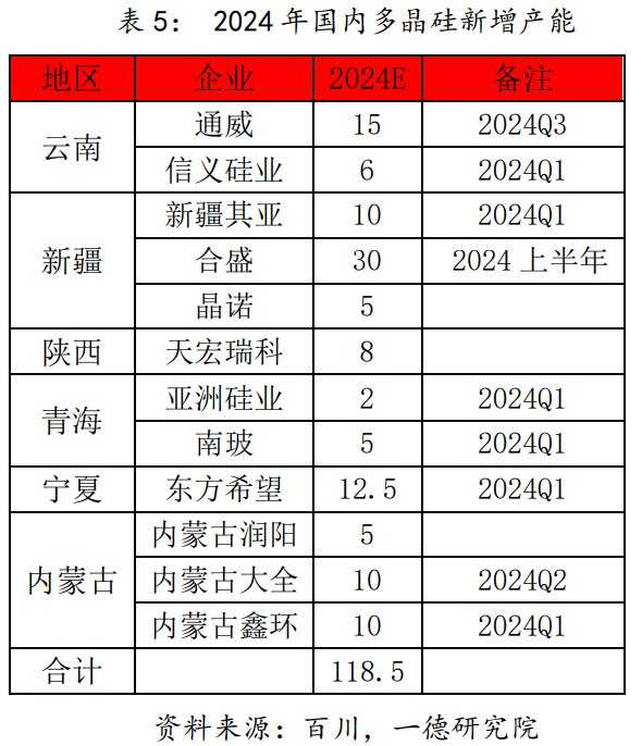 2023年中国多晶硅新增产能接近120万吨,2024年预计新增产能规模也接近120万吨,新增产能项目中大多原为计划2023年4季度投产的推迟项目,且新增产能大多集中在2024年上半年,因此投产确定性强。预计2024年多晶硅产量185万吨,同比增长23%。