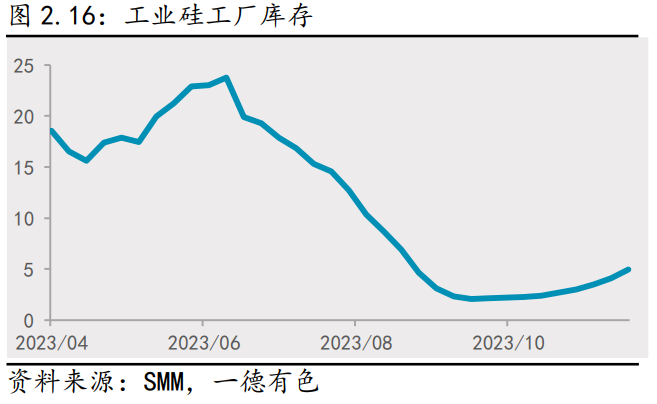 据SMM统计,截至11月底工业硅社会库存37.6万吨,全年库存都处于增长状态中,主要缘由前期隐性库存显性化所致;样本工厂库存5万吨,6月份之后随着注册仓单系统开启,期限商涌入使得硅厂库存明显下滑,9-10月份现货市场成交积极,绝对价格低位吸引终端积极补货,硅厂工业硅库存快速下滑至2万吨,随着下游补库结束,叠加工业硅成本上移硅厂惜售挺价造成硅厂库存增加;当下总库存42.5万吨,接近年底库存或在终端再次补库的节奏下小幅下滑,但难见趋势性下滑。