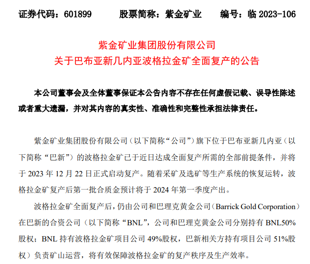 2023年12月10日,紫金矿业公告,旗下巴布亚新几内亚波格拉金矿全面复产。