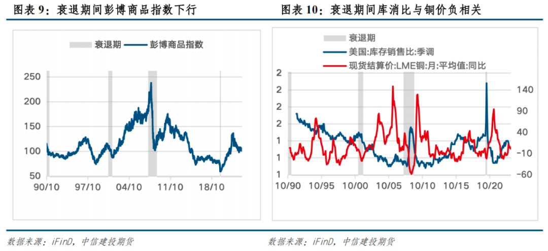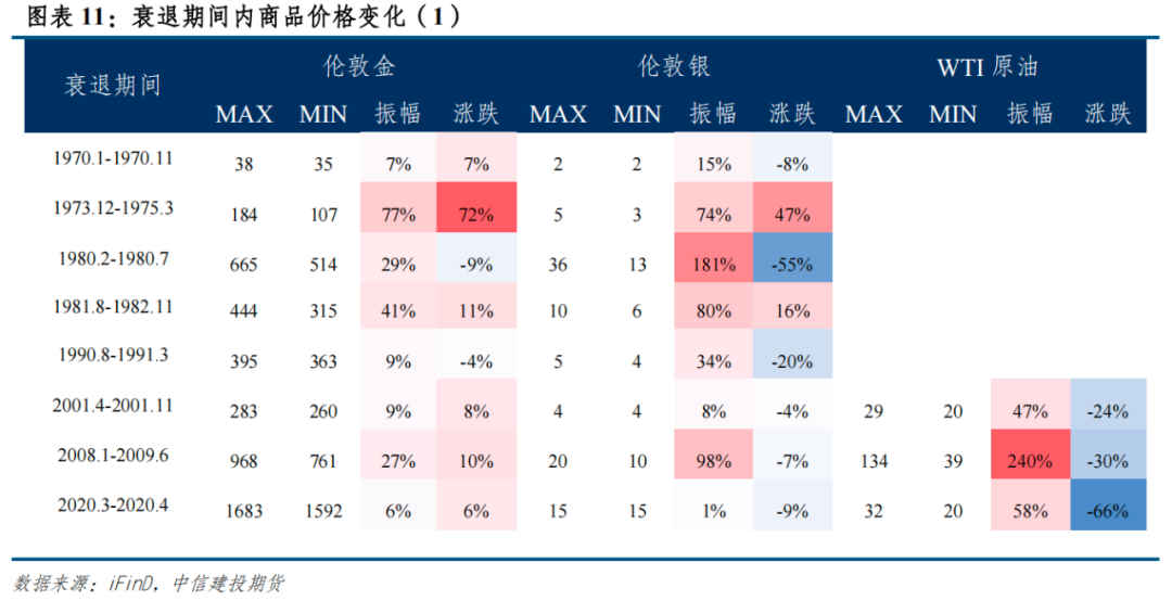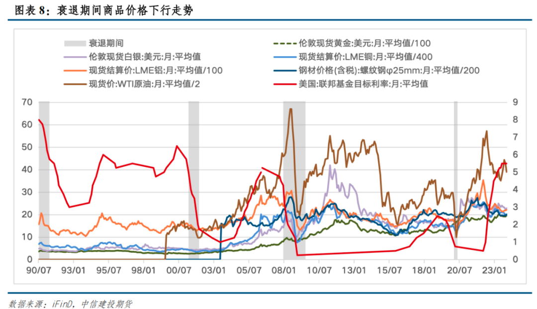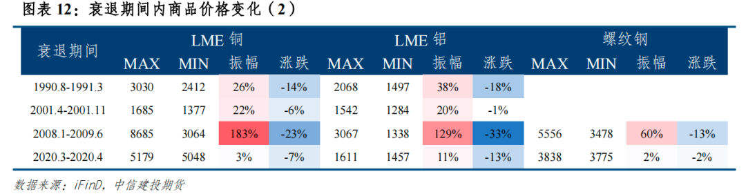 在8次美国经济衰退周期内,LME铜价格跌幅12.82%,LME铝价格平均跌幅16.21%,衰退期内,伦敦金价格平均涨幅12.7%,振幅25.63%。