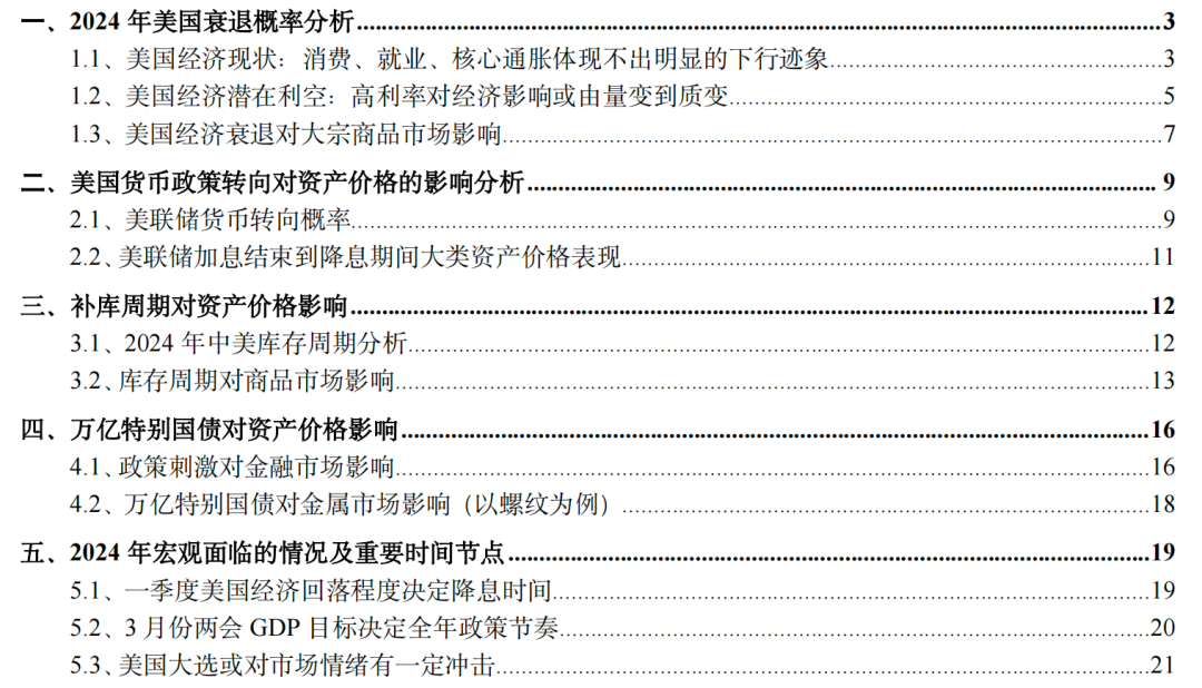 2024年全球重要的时间窗口来看,美国1季度经济表现将决定联储降息节奏,只有经济大幅回落信号得到确认后,美联储才会顺势开启降息,我们预计至少在2季度乃至3季度才会开启降息周期。此外,下半年美国大选,两党博弈或对商品市场情绪形成冲击。国内方面,关注两会对GDP增速目标的确立,财政政策方面实际力度大概率超过今年。