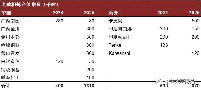 2024-2025年全球粗炼产能扩张可能加剧矿端的紧张格局