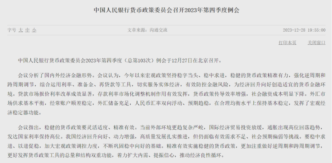12月28日,中国人民银行官网发布消息称,中国人民银行货币政策委员会2023年第四季度(总第103次)例会27日在北京召开。
