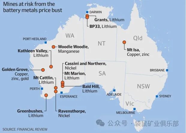 上周,核心锂业(Core Lithium) 公司表示将关闭达尔文附近的格兰治( Grants) 矿,削减 150 个工作岗位。两天后,亏损的萨凡纳(Savannah)镍矿也关闭了,140 个工作岗位不复存在。随着季度报告季的到来,电池矿产行业可能会有更多的矿场关闭,有几家生产商的年度亏损额将超过 1 亿澳元。