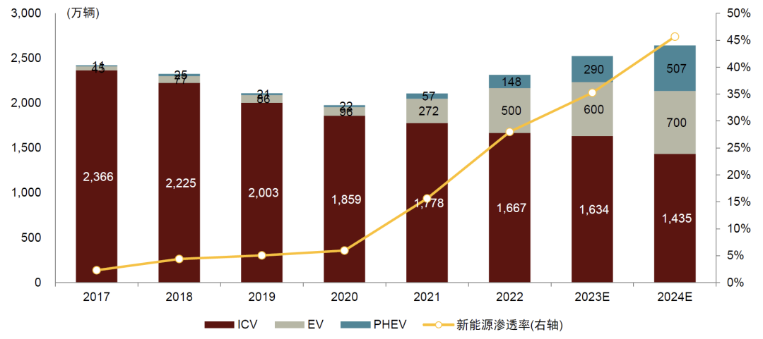 图表18:2017年-2024E中国乘用车分动力销量及新能源渗透率