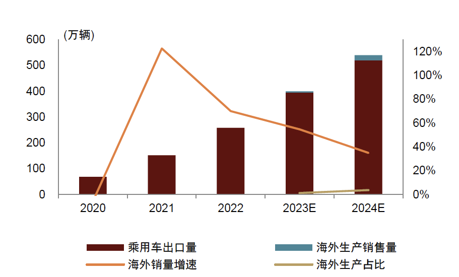 图表9:2020年-2024E中国乘用车出口量和出海量预测