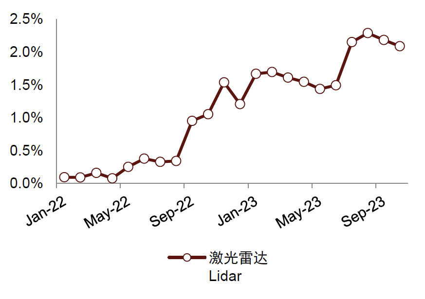 图表25:2023年月度国内乘用车车载激光雷达渗透率