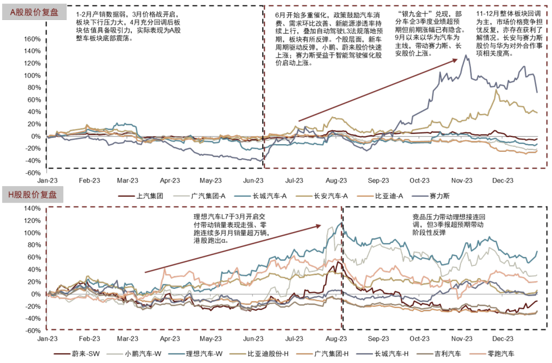 2023年A股整车板块欲扬先抑,1H23理想跑出α,2H23“华为汽车”成为主线,小鹏、蔚来、零跑等新车周期带动边际反弹机会。2023年1-2月产销数据偏弱,3月价格竞争开启,板块下行压力大,4月充分回调后板块估值具备吸引力,但实际表现为A股整车标的底部震荡;理想汽车L7于3月开启交付带动销量表现走强、零跑连续多月月销量超万辆,港股跑出相对α。6月开始多重催化,政策鼓励汽车消费、需求环比改善、新能源渗透率持续上行,叠加自动驾驶L3法规落地预期,板块有所反弹。个股层面,新车周期驱动反弹,小鹏、蔚来股价快速上涨;赛力斯受益于智能驾驶催化股价启动上涨。“银九金十”兑现,部分车企3季度业绩超预期但前期涨幅已有隐含;9月以来以“华为汽车”成为主线,带动赛力斯、长安股价上涨。11-12月整体板块回调为主,市场价格竞争担忧反复,亦存在获利了结情况,长安与赛力斯股价波动与华为对外合作事项相关度高。