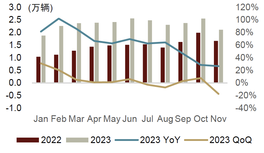 根据乘联会数据,奇瑞汽车、上汽乘用车、长城汽车出口位居前列。11M23奇瑞汽车出口83.6万辆,上汽乘用车出口约59.8万辆。新能源乘用车出口方面,特斯拉、比亚迪和上汽乘用车位居前三,特斯拉出口占新能源乘用车出口比重降至37%左右,比亚迪11M23出口20.7万辆,增量贡献显著。