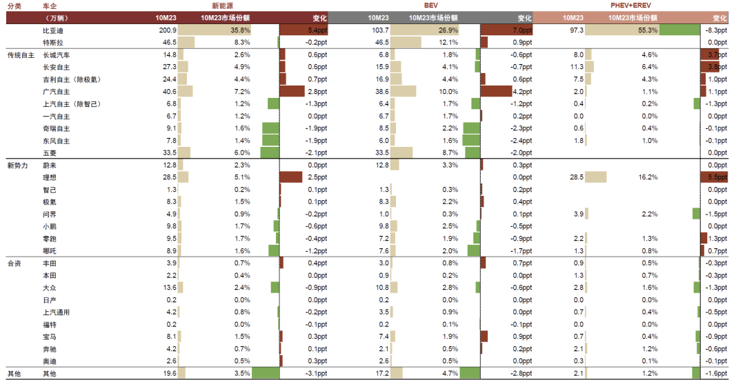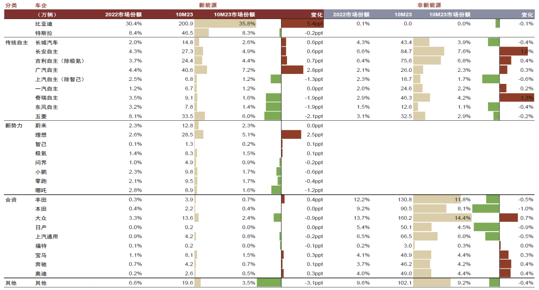新能源方面比亚迪、特斯拉维持强势份额地位,理想强产品周期发力,部分传统头部自主品牌实现份额追赶。10M23比亚迪、特斯拉仍位列新能源市场份额前2,其中特斯拉份额略微下滑。