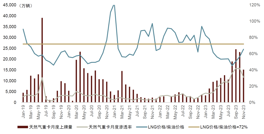 图表37:2023年以来LNG价格/柴油价格比值持续下探带动燃气车渗透率持续提升