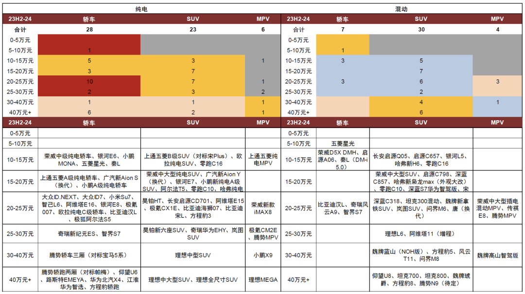 根据我们汇总的2024年主流品牌主要新车规划(截至目前可得信息),20-30万元纯电轿车、10-30万元纯电SUV、10万元以上混动SUV为新车型集中投放市场。综合上述判断标准及新车型情况,我们作出以下分析及判断: