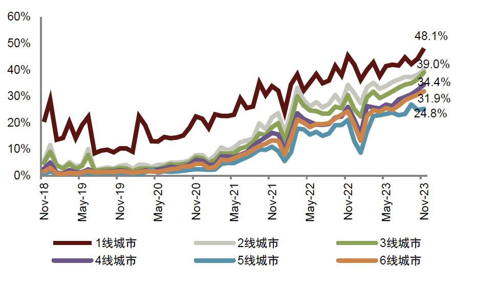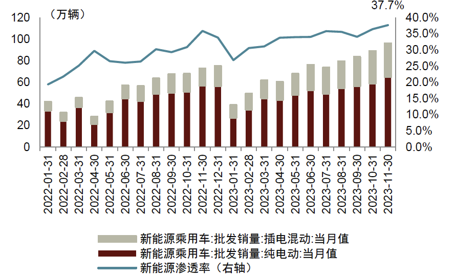 新能源总量继续提升,二三线城市新能源渗透率加速。3Q23以来,据乘联会数据,新能源批发销量口径渗透率呈现加速提升态势,单月新能源渗透率突破35%。我们预计,2023年新能源乘用车批发销量接近890万辆,其中BEV/PHEV分别约600/290万辆,同比+20%/+95%。分城市来看,2023年一线城市新能源渗透率趋于饱和,二三线城市新能源渗透率加速,根据国家金融监督管理总局数据,截至2023年11月,一线城市新能源渗透率已达48%,二三线城市新能源渗透率加速至39%/34%。