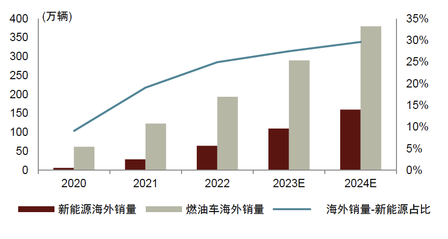 图表10:2020年-2024E中国乘用车海外销售分能源类型预测