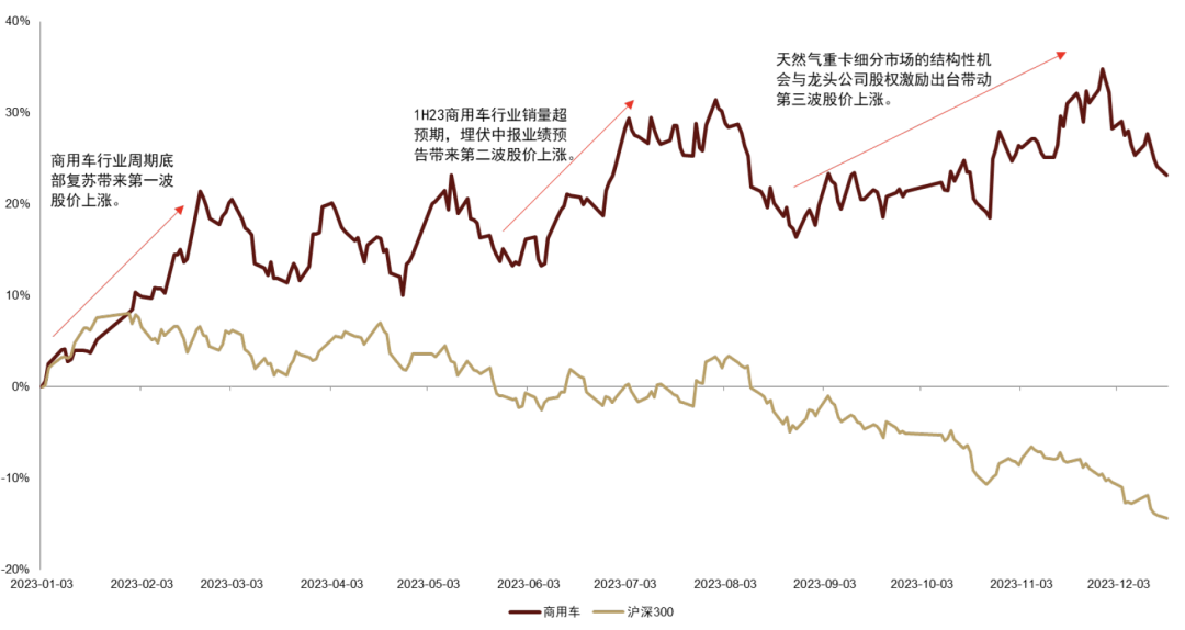 重卡行业股价呈现板块性行情,以销量与业绩为锚、具备抢跑特征,龙头个股亦有催化。2023年以来商用车板块的股价收益率显著跑赢大盘、乘用车整车与汽车零部件板块,有三波显著的上涨行情:1)2022年底持续到2023年3月初,商用车行业周期底部复苏带动板块性股价普涨,中国重汽A/H、中集车辆、宇通客车领涨。2)2023年6-7月,在出口强劲、内需弱复苏的背景下1H23商用车行业销量超预期,商用车行业中报业绩预期同比高增,迎来埋伏业绩预告行情。3)2023年9-11月,受益于天然气重卡细分市场的结构性机会与龙头公司股权激励出台带动,商用车板块股价再度迎来上行。