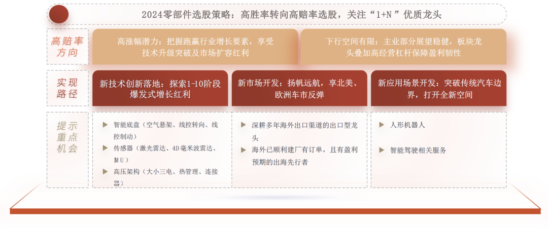 展望2024年,我们认为高赔率标的为能够实现营收端“1+N”的优质公司。“1+N”是指在其主业能够稳定在第一梯队的白马股,同时拓展出“+N”的新增长曲线,包括新市场拓展、新技术创新落地、新应用场景开发等。此外,随着2024年车企“年降”加大预期渐强,我们提示关注符合前述公司中高经营杠杆企业的抗风险优势。