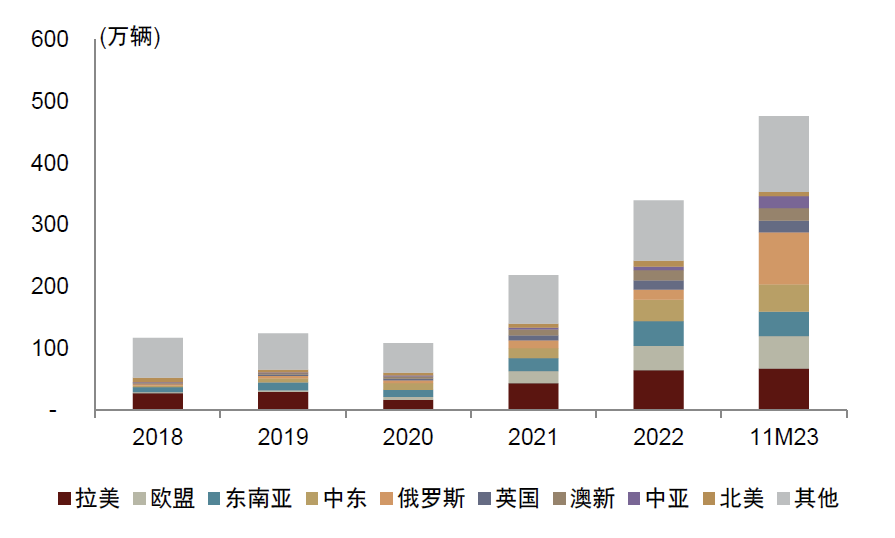 俄罗斯贡献显著增量,自主品牌紧抓窗口期提升份额。复杂国际形势下,11M23中国对俄罗斯出口汽车约84.1万辆,累计同比增长5.5倍,占汽车出口比重的18%,较2022年提升13ppt。根据AEB数据,乘用车中奇瑞和长城表现较好,1-3Q23奇瑞/长城销量达14.7/8.5万辆,中国品牌市场份额超过50%。俄罗斯自2023年8月开始对进口车辆加征报废税,一定程度上抑制终端消费者的购买意愿,但目前经销商和消费者共同承担报废税成本,对消费者购车压力有所减轻;我们认为对本土设有工厂的海外车企影响相对更小。考虑2023年的高基数,我们预计2024年向俄罗斯出口汽车的增速或将放缓,但受益于俄罗斯市场需求恢复、供给端新进入者有限,有望保持一定增长。