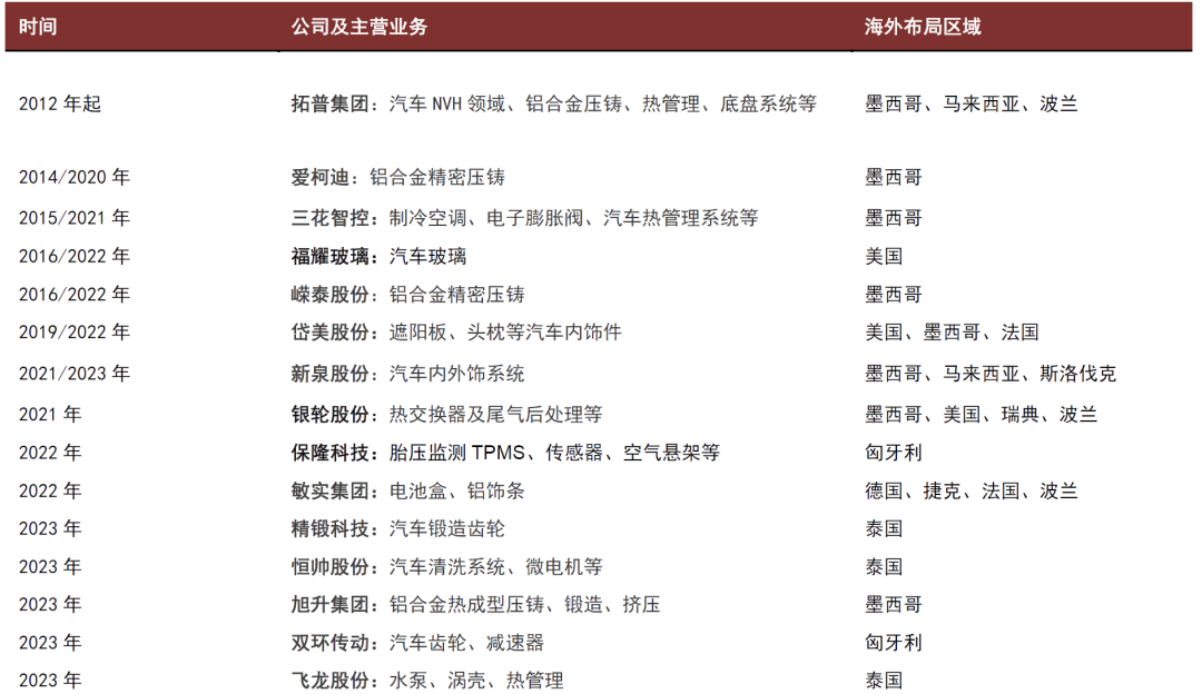 图表33:近三年中国重点汽零厂商加速海外产能布局(截至2023年12月)