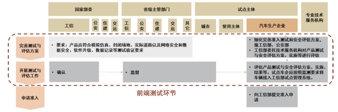 测试体系趋于完善,L3/L4智能驾驶准入试点出台加速车辆检测方案加速落地。智能网联车辆测试的参与方包括车企与专业技术服务机构,其中工信部委托技术服务机构对产品测试与安全评估方案、实施、结果等进行评估。测试内容包括:1)在模拟仿真、封闭场地、实际道路各场景的测试;2)进行整车网络安全和数据安全测试、软件升级测试、数据记录测试等。
