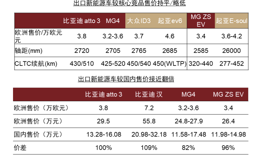 欧盟反补贴调查短期影响有限,为中长期中国汽车出海敲响警钟。2023年10月4日,欧盟对华电动车反补贴调查正式开启[1]。短期来看,欧盟是中国最大的新能源出口市场,11M23占比约30%,但占自主车企自身总销量比重相对较小,对我国车企总体经营影响有限,比如上汽计划2023年欧洲市场销量突破20万辆,总销量目标600万辆,占比总销量目标仅在3%。同时,我国出口车型在欧洲售价较核心竞品售价基本持平,反补贴调查最终的判定结果仍未给出。考虑到汽车产业的重要性,伴随中国品牌海外销量规模扩大,我们认为后续不排除存在更多保护本土品牌的措施,直接出口模式的风险提升,产能出海与合资合作或为应对方式。
