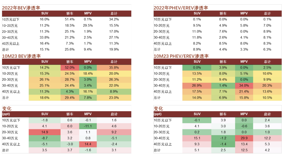 BEV:10-20万元纯电轿车、20-30万元纯电SUV(Model Y降价导致价格重分类影响)、40万元以上纯电MPV渗透率提升幅度最大;供给有限,10-20万元纯电SUV市场及MPV市场为BEV渗透率低洼区。