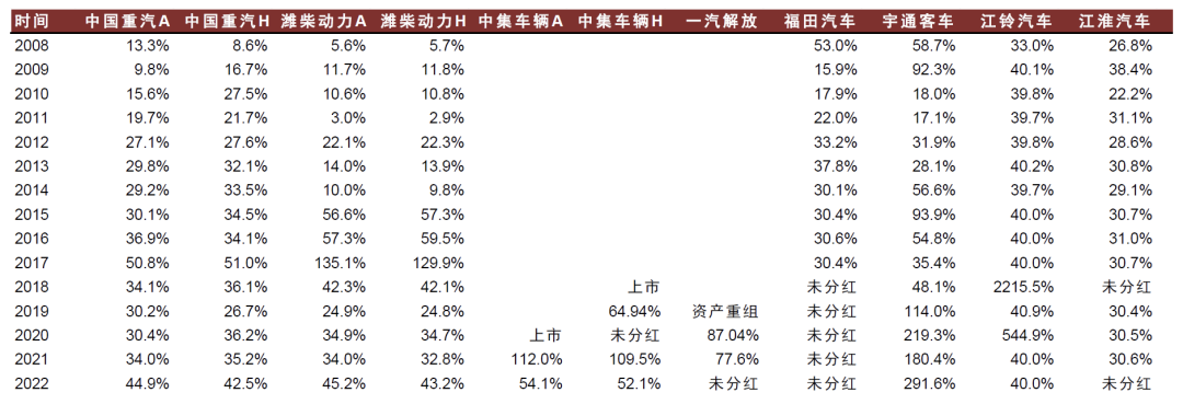关注商用车板块高股息高分红机会,防御属性突出。商用车板块分红比例整体上不断提升,分红比例与股息率显著高于汽车板块平均水平。我们复盘了过去15年的汽车板块现金分红比例与股息率,根据我们测算,A股商用车板块现金分红比例从2008年的平均值25%逐渐提升至2022年的45%(高于A股汽车板块均值33%),港股商用车板块现金分红比例从2008年的平均值5%较快提升至2022年的48%(高于港股汽车板块均值24%)。我们认为商用车板块企业具备较强的高分红派息意愿。此外,我们认为商用车板块大部分个股的账面现金充裕,资本开支高峰期已过,具备高分红的条件与能力。