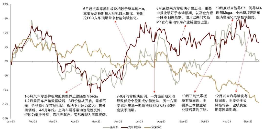 注:汽车零部件板块采用中信汽车零部件II指数(CI005138.WI),乘用车板块采用中信乘用车II指数(CI005136.WI),假设2023年1月3日各板块指数收益率均为0