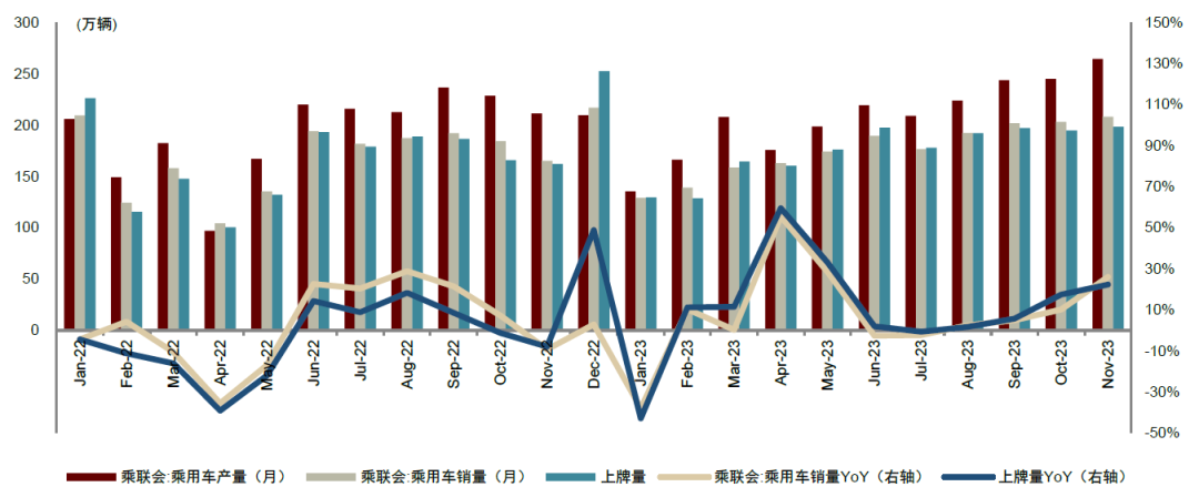 图表1:2022年-11M23乘用车产量、批发量及上牌量