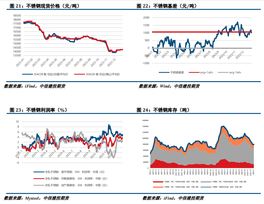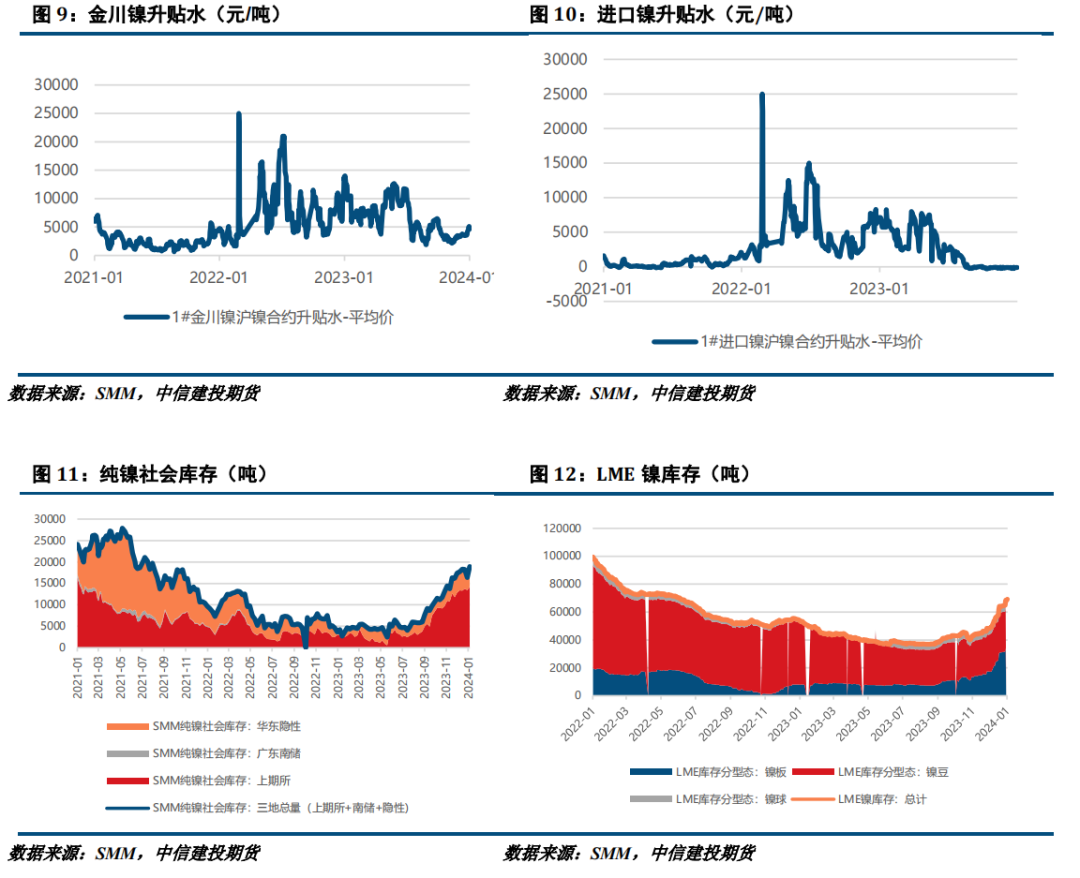 上周纯镍价格上涨。宏观方面,美国通胀意外反弹,美联储提前降息的预期走弱,再叠加地缘政治扰动升级对原油等大宗的影响,镍价或在宏观面面临压力。成本角度看,受中间品价格回升影响,电积镍成本在上周小幅反弹,对镍价上行形成了一定的驱动作用。供应方面,市场开始观望2024年电积镍企业是否会选择减产;本周随着金川资源到货,金川镍紧缺的情况有所好转,华友和格林美资源则因为自供比例提高导致现货供应有所收紧。需求方面,受镍价上涨影响,下游企业开始选择观望。库存方面,受供应放量、需求走弱等因素影响,国内社库和LME库存双双累库,继续对镍价施加压力。总的来说,目前纯镍供需双弱,镍价中枢仍在锚定电积镍成本,但是累库压力或将使得镍价上方空间有限。