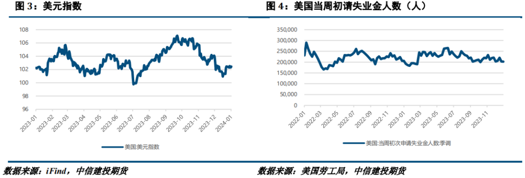 美国通胀意外反弹,削弱美联储降息押注。美国劳工部公布数据显示,美国2023年12月未季调CPI同比上涨3.4%,预期3.2%,前值3.1%;季调后CPI环比上升0.3%,预期0.2%,前值0.1%。剔除波动较大的食品和能源价格后,美国2023年12月核心CPI同比上涨3.9%,创2021年5月以来新低,预期3.8%,前值4%;环比上涨0.3%,与预期及前值持平。美国CPI数据发布后,美联储2024年3月和5月降息可能性下调。美联储巴尔金:12月CPI数据大致上符合预期;重申不会预先判断三月份美联储将降息,并表示将密切关注1至3个月的PCE数据。美联储博斯蒂克表示,预计美联储将在第三季度进行首次降息;缩表速度是否应该改变是一个开放性问题。目前的缩表速度“适当”。重申认为在今年年底前两次降息25个基点是合适的;政策在年底仍需保持紧缩,但通胀进展将支持降息。
