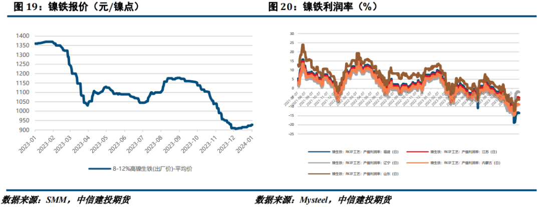 上周镍铁价格小幅上涨。成本方面,成本端镍矿价格处于低位,叠加近期铁价反弹,使得镍铁厂利润开始修复。供应方面,印尼镍铁发运量环比回落明显,但到港量依然偏高,镍铁过剩压力不减;据Mysteel数据,本期(2024.1.4-2024.1.10)印尼镍铁发往中国发货7.23万吨,环比降幅59.79%,同比降幅0.01%,到中国主要港口30.3万吨,环比增幅84.3%,同比增加468.31%,目前印尼主要港口共计13条镍铁船装货/等待装货,较上期环比增幅62.5%。需求方面,钢厂存在节前备原材料的需求,不过由于当前铁价偏高,市场博弈心态再度显现。总的来说,铁价持续反弹使得下游接受度减弱,市场博弈或将使得铁价反弹放缓。