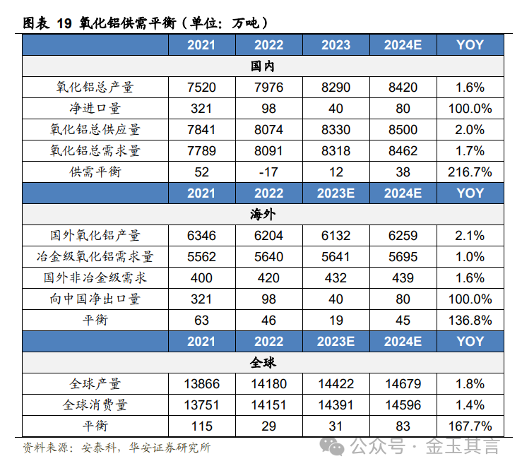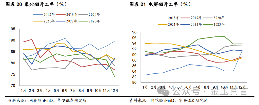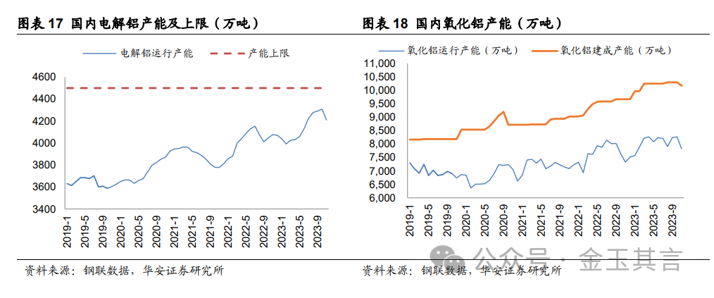 减产和增产并行,氧化铝供需基本平衡。从国内来看,2023年尽管氧化铝产能持续扩张带动产量增加,但开工率仍处于相对低位,而2023年电解铝开工率均在90%以上。在“产能天花板”之下,电解铝产量增长空间有限,氧化铝新投产产能增长,同时伴随部分地区减产:如河南广西等地检修减产、河北山东等地环保限产等。2023年底至2024年初,减产趋势更加明显,除了环保和检修之外,矿石紧张也成为导致减产的重要因素,根据爱择咨询,三门峡限产后某企因氧化铝矿石供应不足计划决定减产,初步计划压产50%产能,并且在目前矿石供应形势严峻的情况下,若近期矿石无法及时补充,其产线或将全停,且暂无复产计划。