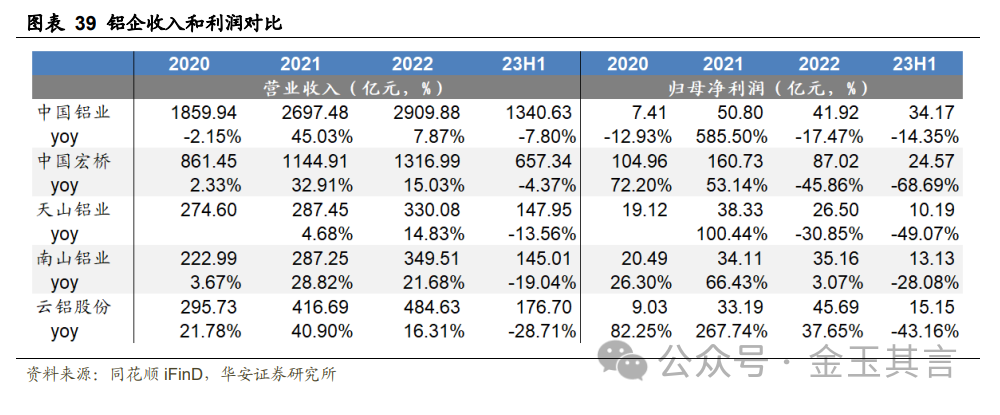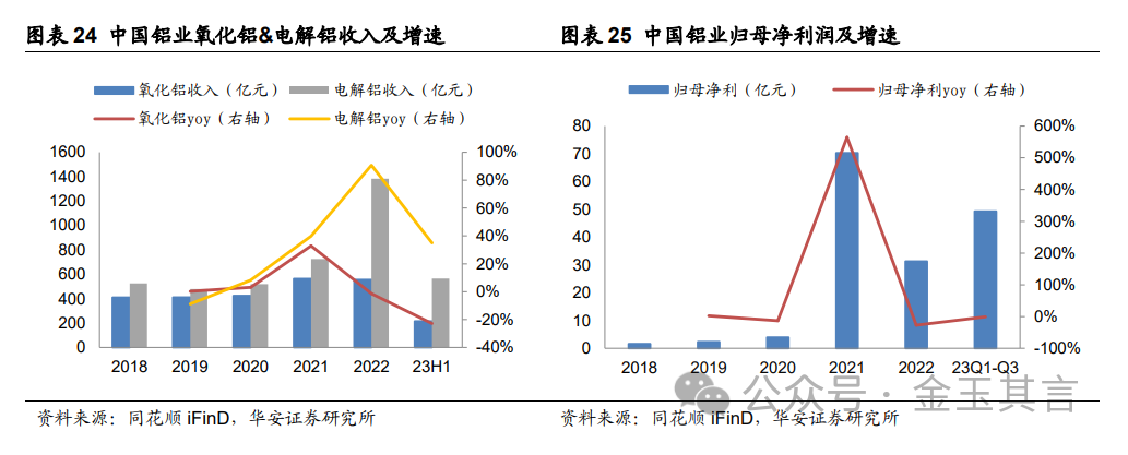 全球铝业龙头,完善产业链业务布局。中国铝业隶属中铝集团,是全球最大的氧化铝、原铝产能、精细氧化铝、高纯铝和炭素生产企业。2022年,公司铝土矿产量2812.83万吨,氧化铝产量1764万吨,电解铝产量688万吨,公司铝土矿自给率接近70%、氧化铝自给率达100%且有部分外销。2022年云铝股份并表,电解铝收入大幅提升,同时由于公司部分氧化铝供给云铝股份生产电解铝,因此氧化铝收入有所下滑。从利润端来看,由于2022年和23H1电解铝价格下降,公司利润有所下滑,但23Q3以来伴随电解铝价格回升,公司业绩逐步修复。
