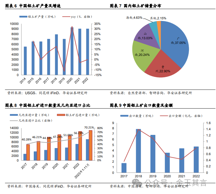 国内铝土矿集中,供给偏紧。2022年中国铝土矿总产量9000万吨,相较于2020年有所减少,2019年以来铝土矿产业受到环保督察、矿山整顿等限制出现减产,国内铝土矿对外依存度有所提升,进口金额和数量逐年增长,2022年铝土矿进口量1.25亿吨,进口依赖度将近60%,其中几内亚进口占比56.2%,2023年1-11月几内亚铝土矿进口占总进口量的比重已达70.2%。从分布来看,中国铝土矿集中在山西、广西、贵州和河南四省,合计储量占全国总储量的93.22%。其中广西省以三水型铝矿为主,资源禀赋最佳,而其他大部分地区均为一水型硬铝矿,加工困难、耗能较大,并且国内适合露采的铝土矿矿床数量偏少,开采难度较大。