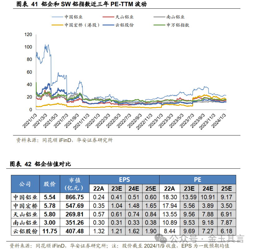 当前铝指数估值低于历史三年均值。截至2024年1月9日收盘,中国铝业、天山铝业和申万铝指数PE-TTM分别为22.93、14.32和15.90,历史三年平均值分别为29.43、14.04和16.73,铝板块整体估值仍然处于较低位置,考虑到氧化铝供给偏紧,我们认为原料自给率高的铝企更具配置性价比,建议关注中国铝业、中国宏桥和天山铝业。