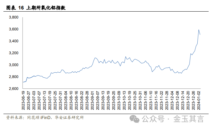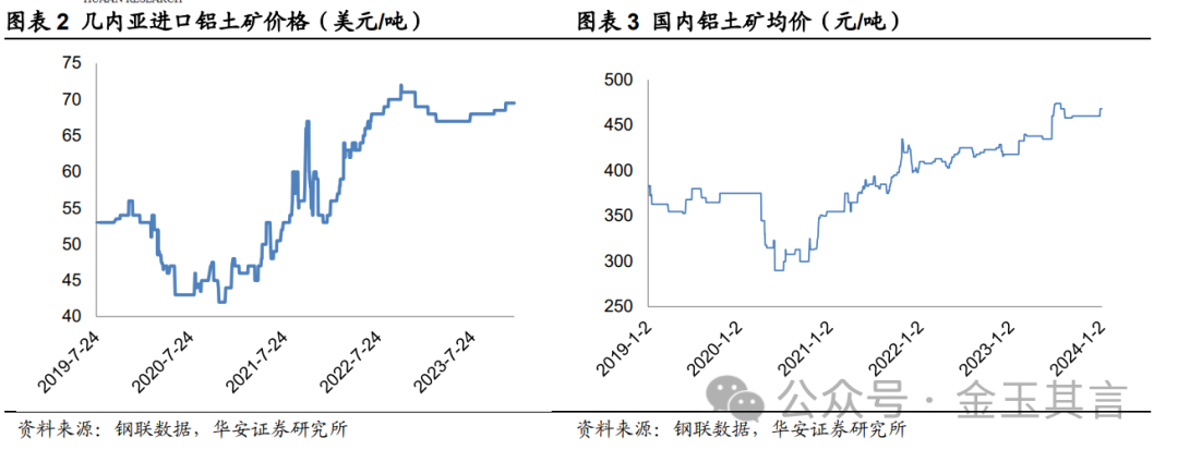 氧化铝制备90%采取利用烧碱和铝土矿反应的拜耳法,根据中研网的数据,生产1吨氧化铝大概需要2.3吨铝土矿和0.13吨烧碱,因此氧化铝的价格波动受到铝土矿和烧碱的供给影响,铝土矿占氧化铝成本结构的比重约37%。2023下半年河南三门峡铝土矿复垦停产、北方地区环保限产,12月几内亚事件进一步加剧铝土矿供给矛盾,带动氧化铝价格上涨