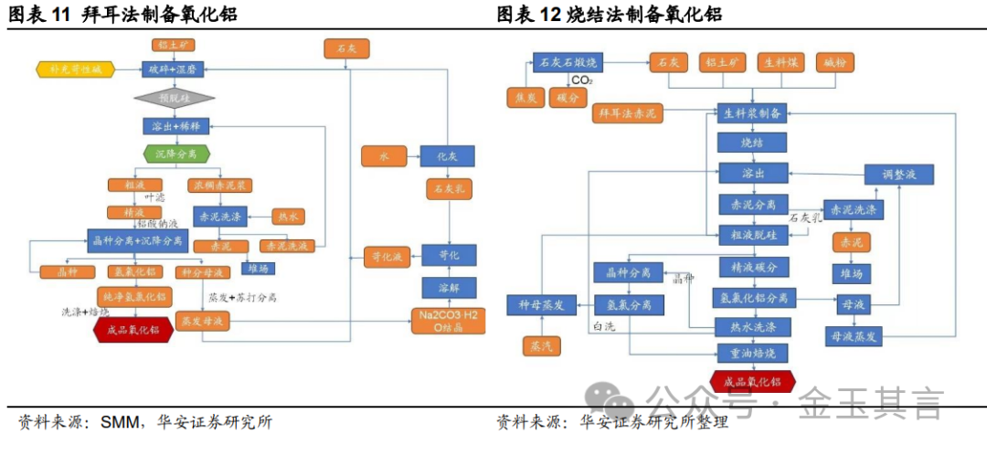 氧化铝的提取一般有拜耳法、烧结法和联合法三种。拜耳法主要是利用烧碱和铝土矿中的铝元素反应形成铝酸钠溶液,再分解析出氢氧化铝,并煅烧提取氧化铝;烧结法则是将铝土矿和石灰石、纯碱烧结为含有铝酸钠的熟料,再通过稀碱溶液溶出并脱硅提纯铝酸钠,最后通入二氧化碳提取氢氧化铝并煅烧得到氧化铝。由于拜耳法能耗等成本更低、工艺流程更简单,因此全球90%左右的氧化铝均通过拜耳法制备。