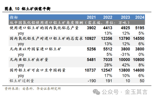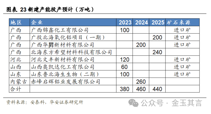 氧化铝仍有较多在建拟建产能,主要依赖进口矿。根据百川盈孚,未来几年预计新增1000余万吨氧化铝产能,根据安泰科,广西、河北、山西等地的八个项目预计2023/24/25年分别投产380、460、440万吨氧化铝,其中6个项目的矿石来源均为进口,进口矿石量制约国内氧化铝产能的释放。我们认为尽管规划产能较多,但氧化铝产量并非无序扩张,而需要结合下游电解铝的需求和上游铝土矿的供给。2023年贵州、广西等地区均发文表示新扩建氧化铝项目需落实与产能规模匹配的权益铝土矿产量。在国内频繁限产、海外供给波动的情况下,我们认为具备稳定矿石来源的企业可以更高效地实现扩产。