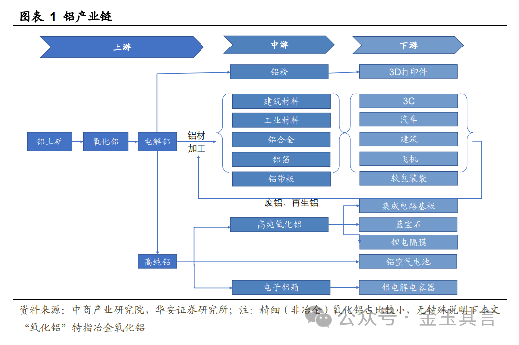 铝产业链主要由铝土矿开采、氧化铝提炼、电解铝和铝材加工四环节构成。铝元素在地壳含量约8.3%,仅次于氧和硅,主要以铝土矿的形式存在,铝土矿开采后可以利用碱和石灰反应制备为氧化铝,氧化铝作为原料同碳和氟化铝在电解作用下制成电解铝。铝金属具备密度小、延展性好、导热和导电性能优异、耐氧化等特点,可运用于航空航天和汽车工业(铝合金轻质高强,替代钢铁提升续航能力)、电力工业(尽管导电性能不及铜,但是单位质量下铝的导电性更强,适用于远距离电力传输)、热交换器、包装行业(延展性好,可以制成铝箔)等。