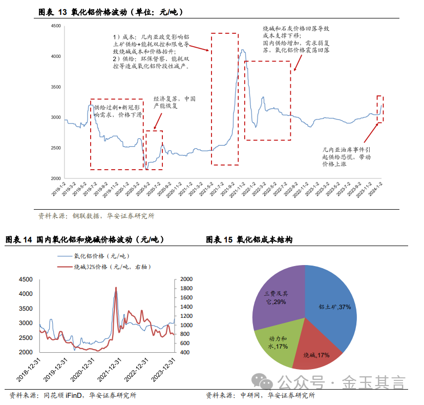 氧化铝的价格受到铝土矿和烧碱价格的影响。根据中研网的数据,生产1吨氧化铝大概需要2.3吨铝土矿、0.5吨煤炭、0.13吨烧碱和0.25吨石灰,氧化铝成本中37%来自铝土矿、17%来自烧碱,因此氧化铝价格受到铝土矿和烧碱波动的影响。复盘氧化铝价格波动,不仅受到供求关系的影响,也受到上游铝土矿、烧碱、石灰以及能源价格的波动影响。2021年下半年,由于几内亚政治事件影响铝土矿供给,叠加国内限电导致氧化铝成本上升,环保督察和能耗双控造成阶段性减产,氧化铝价格持续提升;2021年11月后伴随烧碱和石灰价格回落,氧化铝成本支撑下移,2022年全年氧化铝价格震荡回调。2023下半年北方地区环保限产,12月几内亚事件进一步加剧铝土矿供给矛盾,带动氧化铝价格上涨。