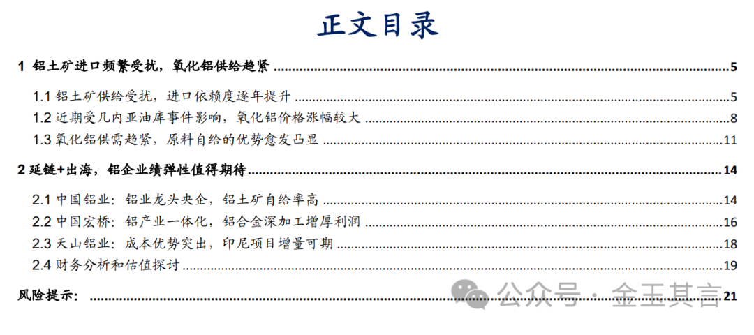 铝土矿进口频繁受到扰动,国内铝土矿供给有限,而下游电解铝行业由于停复产成本较高,需求相对刚性,氧化铝供需走向趋紧,我们认为氧化铝原料供给将成为后续铝产业的主要矛盾。伴随氧化铝成本抬升,具备铝土矿-氧化铝原料布局的企业将持续受益,建议关注自给率较高的中国铝业、中国宏桥和天山铝业。
